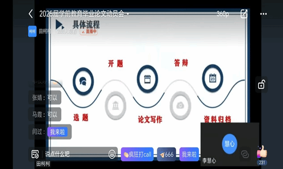 为深入贯彻人才培养的高质量标准,全面提升毕业论文的品质与规范性管理,太阳集团tcy8722于2024年11月25日19:00,通过钉钉平台以线上直播的形式,召开了2025届学前教育及小学教育毕业论文动员大会。太阳集团tcy8722经理郑宽明、执行经理拓梅梅、经理助理温馥榕、教学秘书归阳阳、学前教育系系主任李月星、小学教育系系主任金得华、毕业论文相关负责老师以及2025届全体毕业生参加了本次会议。