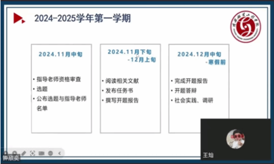 随后,由李慧心老师、王灿老师详细介绍了毕业论文工作的具体流程,包含毕业论文写作流程及论文撰写过程中每个阶段的时间节点、论文写作要求、注意事项等内容,并强调了写作中的规范性问题。